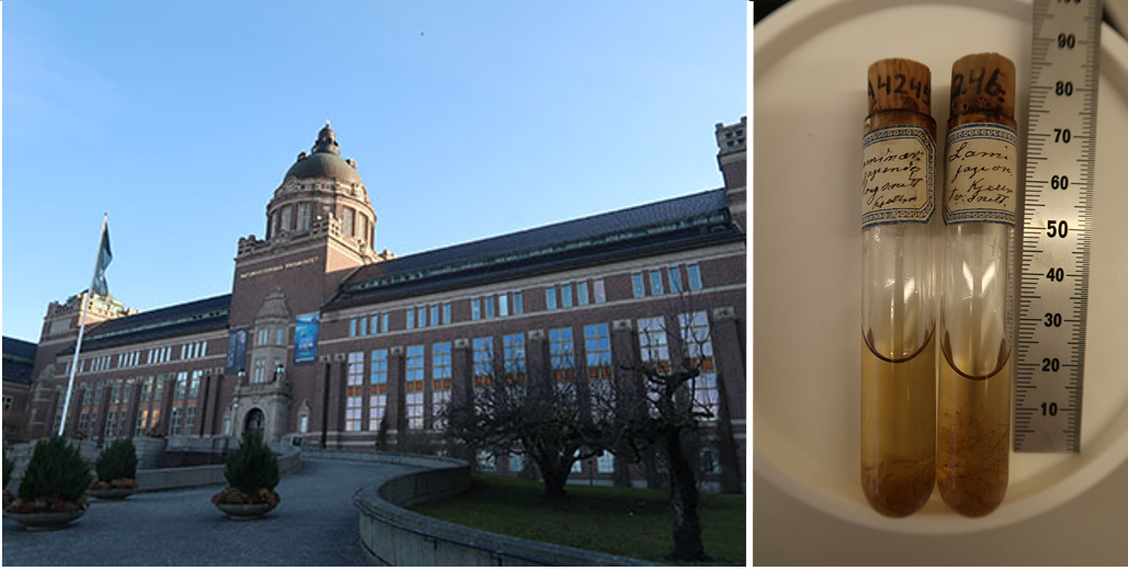 ようやく2026年3月に、望んでいた博物館訪問を果たす機会に恵まれました。「ここには2つのL. japonica標本がありますよ」と聞いてワクワクしながら標本庫に向かったのですが、それらは試験管に入った葉体断片のアルコール標本(図4)。それでも、もしかして-大きな藻体なのでさく葉標本にできないから断片の標本として残したのか-と思い、手に取った瞬間、試験管に貼られているラベルにKjellmanの文字が。採集者はAreschougの次世代の藻類学者Frans Reinhold Kjellmanでした。その後も一生懸命調べましたが、日本で採取されたコンブ標本はいくつか見つけられたものの、お目当ての標本は見つかりませんでした。標本は一体どこにあるのでしょうか。